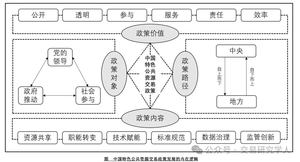 總體而言,我國(guó)公共資源交易政策發(fā)展的內(nèi)在邏輯可從政策價(jià)值、政策對(duì)象、政策內(nèi)容與政策路徑四個(gè)維度進(jìn)行闡釋。就政策價(jià)值而言,呈現(xiàn)出公開(kāi)、透明、參與、服務(wù)、責(zé)任和效率多重兼顧的導(dǎo)向;從政策對(duì)象來(lái)看,展現(xiàn)出黨的領(lǐng)導(dǎo)、政府推動(dòng)和社會(huì)參與的多元協(xié)同模式;在政策內(nèi)容上,資源共享、職能轉(zhuǎn)變、技術(shù)賦能、標(biāo)準(zhǔn)規(guī)范、數(shù)據(jù)治理、監(jiān)管創(chuàng)新共同構(gòu)筑起六位一體的多元要素體系;就政策路徑而言,形成了中央自上而下的政策引導(dǎo)與地方自下而上的政策創(chuàng)新的雙重耦合機(jī)制。